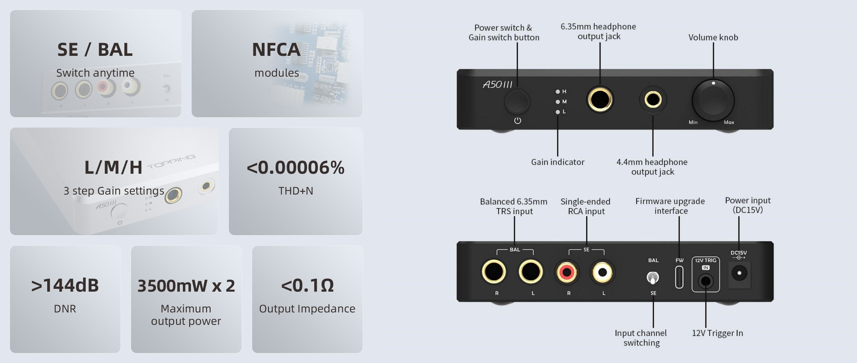 - The TOPPING A50 III uses the same NFCA(Nested Feedback Composite Amplifier) module from A50s. Voltage Current hybrid feedback architecture along with UHGF(UltraHigh Gain Feedback) technology provides excellent DC and AC performance. High output current drive capability allows the amp driving low impedance headphones with ease.
