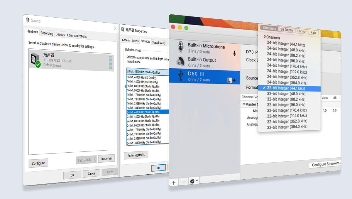 - D50 III has a wide range of compatibility and apply to various OS such as Windows 10, Windows 11, MAC, Linux and iOS/Android. Only for Windows ASIO applications, you need to install the driver and set it up. The USB hardware is based on XMOS XU316 and Thesycon driver (Drivers only for Windows, other OS needn't driver).In addition, the D50 III supports up to PCM768kHz/32bit and DSD512.
