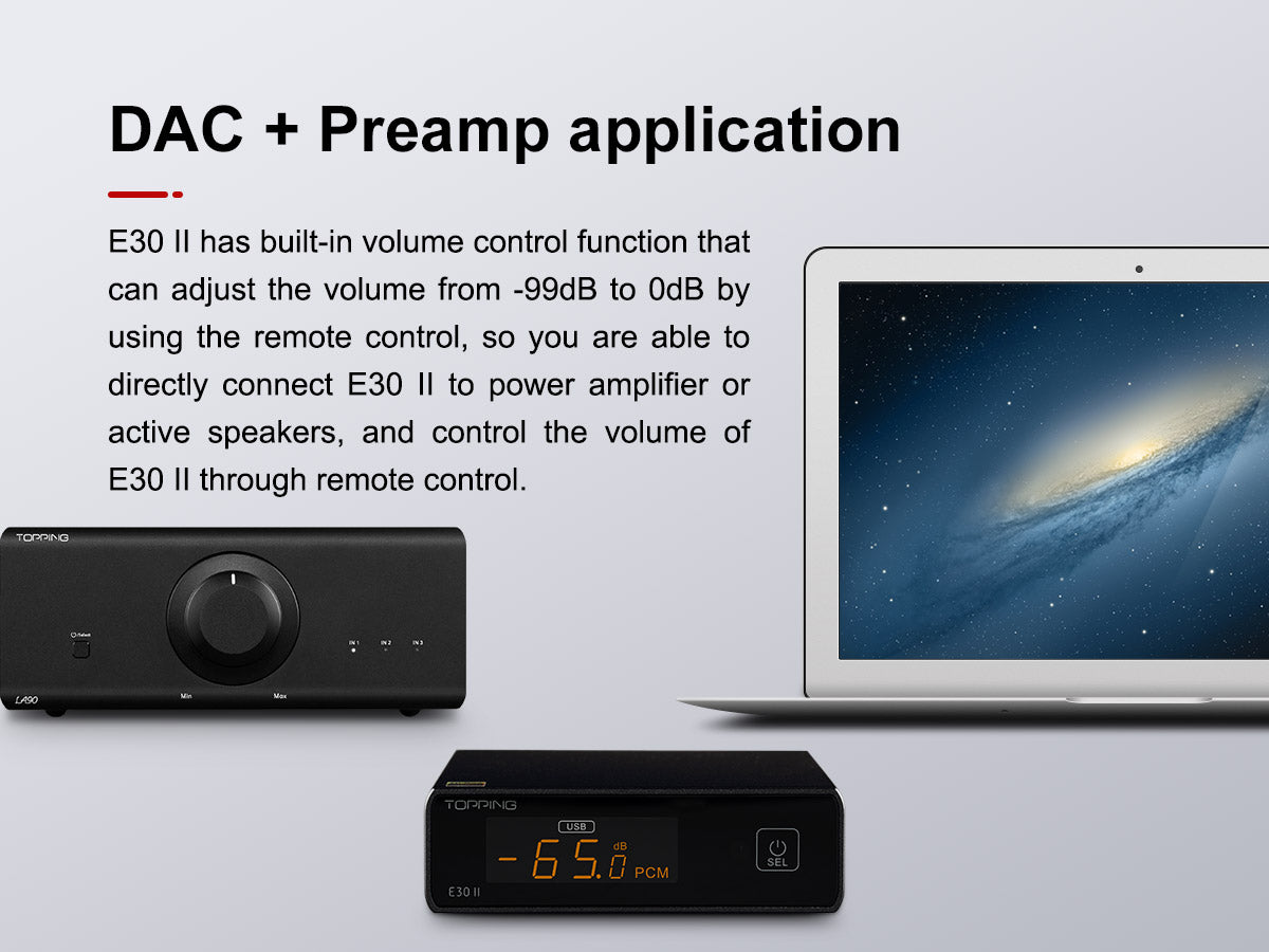 Yes, the E30 II has a built-in preamp mode with adjustable volume control via remote, making it ideal for active speakers and amplifiers. When paired with the TOPPING L30 II amp, it delivers refined audio for headphones.