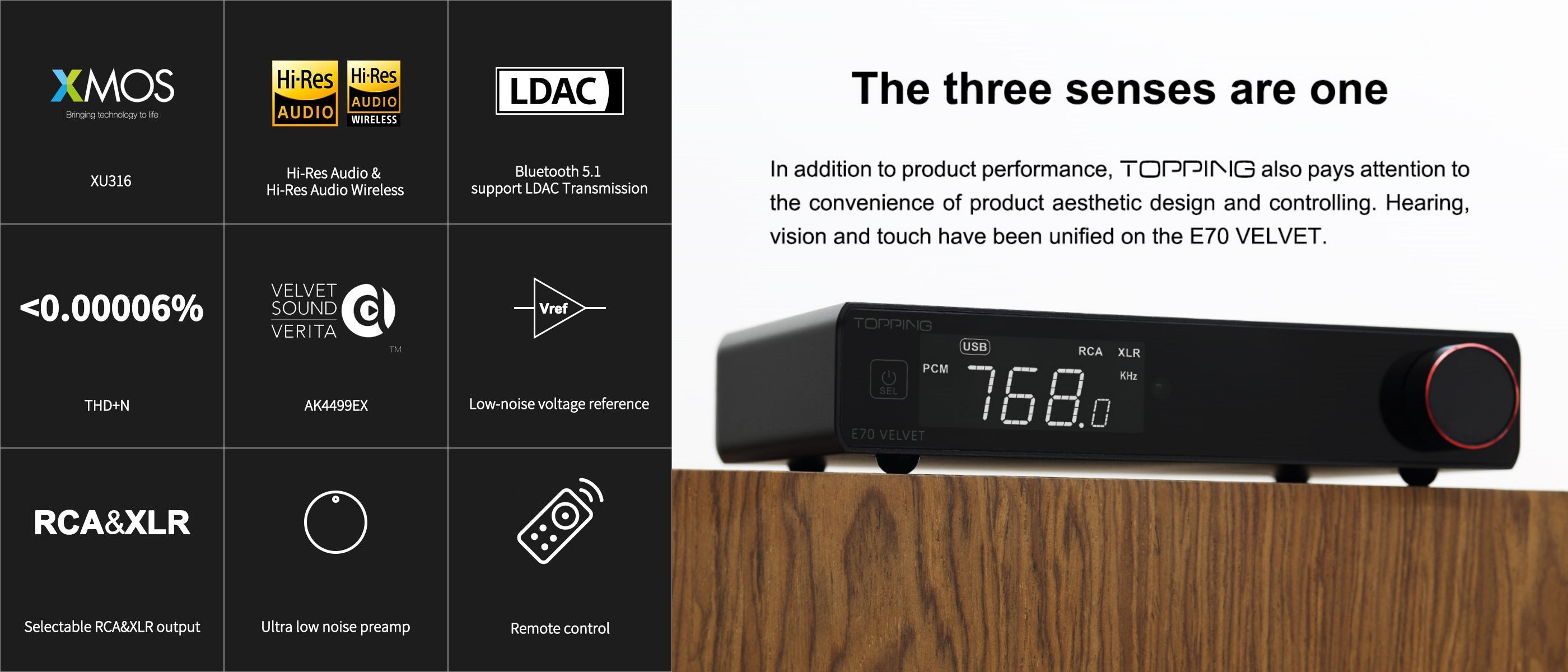 - TOPPING E70 VELVET has balanced XLR output and single ended RCA output.You can choose “XLR only”, “RCA only” or “XLR+RCA" output for different applications.