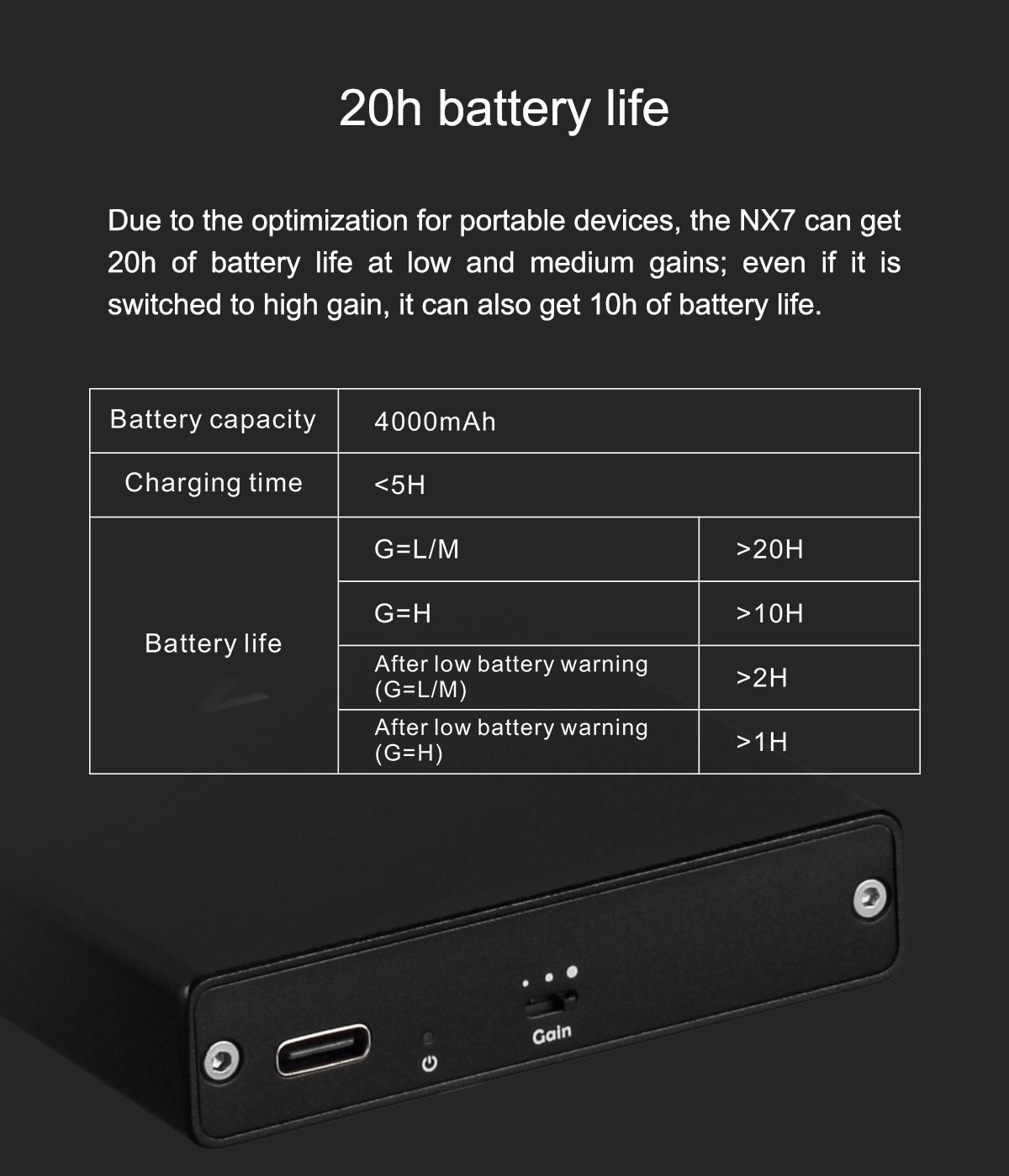 Up to 20 hours. At low or medium gain settings, the TOPPING NX7 offers up to 20 hours of continuous playback. Even at high gain, it still delivers around 10 hours, making it perfect for all-day use on the go.
